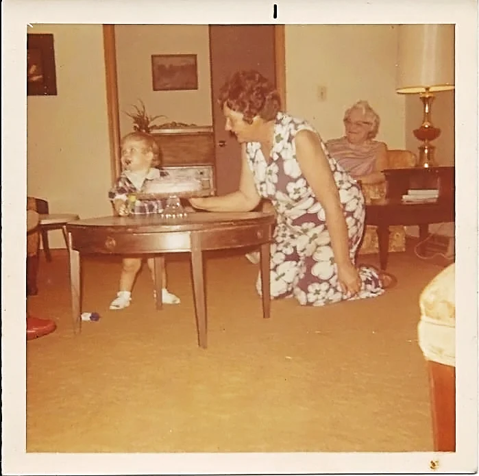 My mom(grandmother) and me. I'm guessing it was my first birthday. I believe in the back that is "Aunt" May. She lived to be 103. My mom passed away about 15 years ago.