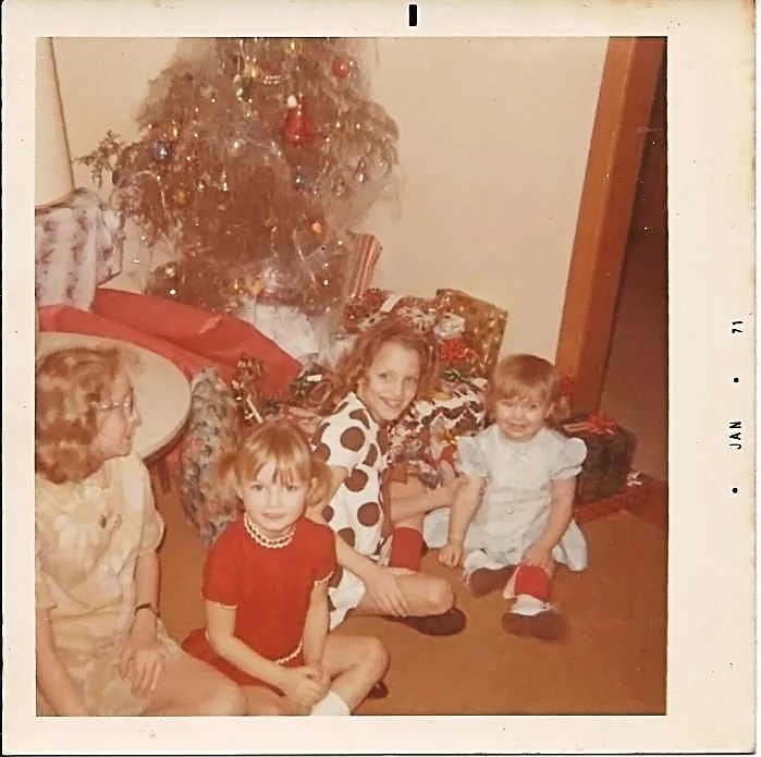 My cousins, Terri, Rhonda, Debbie and Me (2yr old) Notice the saddest, ugliest Christmas tree in the history of EVER! It looks like it has cobwebs all over it!